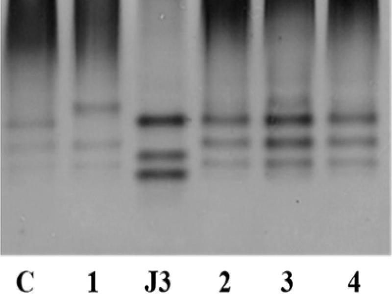 Esterase phenotypes of protein homogenates from five egg-laying females of Meloidogyne species isolates. C – M. luci (positive control); 1 – M. ethiopica isolate from Brazil; J3 – M. javanica (reference isolate); 2 – M. luci (Cordyline australis); 3 – M. luci (Solanum lycopersicum) and 4 – M. luci (Oxalis corniculata).