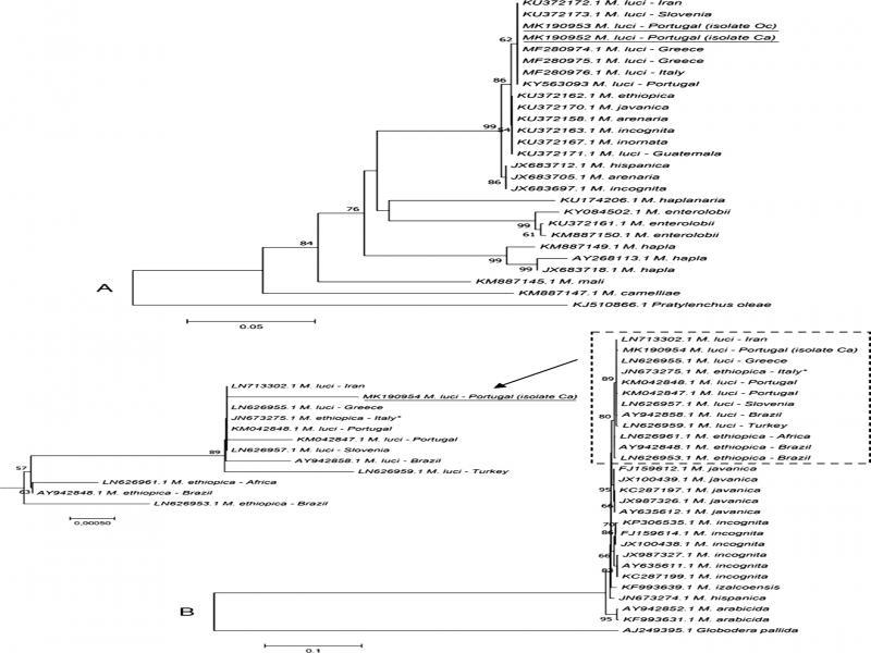Phylogenetic relationship of Meloidogyne spp. sequences based on the alignment of sequences of cytochrome oxidase subunit I (A) and cytochrome oxidase subunit II (B) of mitochondrial DNA with available sequences of other Meloidogyne species. The phylogenetic tree was generated in MEGA7 using the Neighbour-Joining method. The percentage of replicate trees in which the associated Meloidogyne spp. clustered together in the bootstrap test (500 replicates) is shown next to the branches. The evolutionary distances were computed using the Jukes-Cantor method. All positions with less than 95% site coverage were eliminated. That is, fewer than 5% alignment gaps, missing data, and ambiguous bases were allowed at any position. *Recently, reclassified as M. luci, according to Stare et al. (2017).