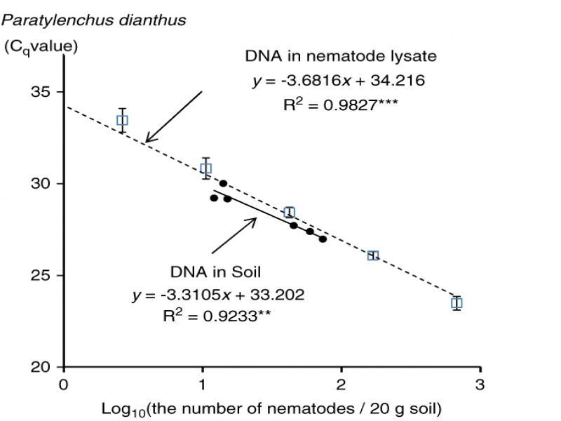 Relationship between calibration curves of soil DNA samples and nematode lysate for Paratylenchus dianthus. Solid line: a calibration curve derived from DNA samples extracted from Ch12 experiment at two-month after planting. Dotted line: a calibration curve derived from DNA samples extracted from nematode lysate. The curve was related to the DNA concentrations equivalent to the ones obtained by using DNA samples from soils. ***p < 0.001 and **p < 0.01.