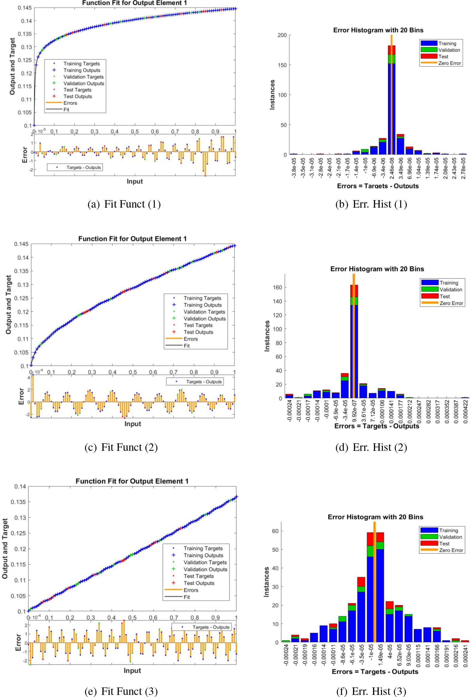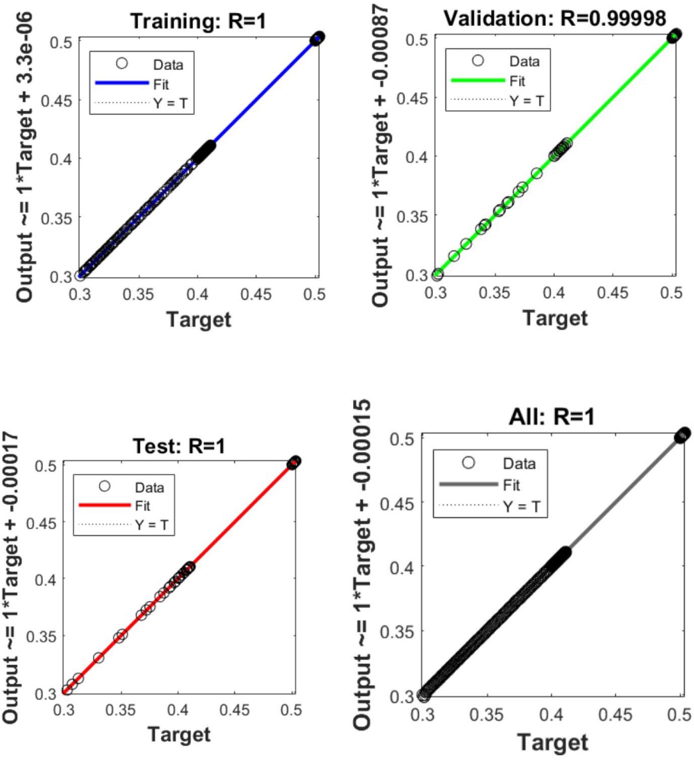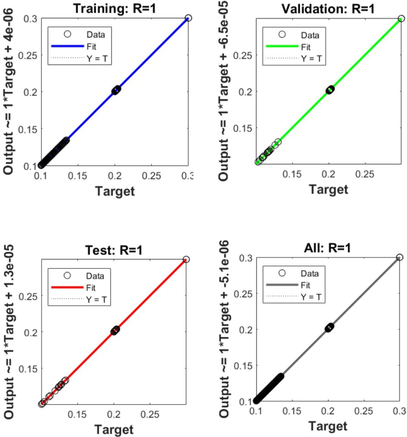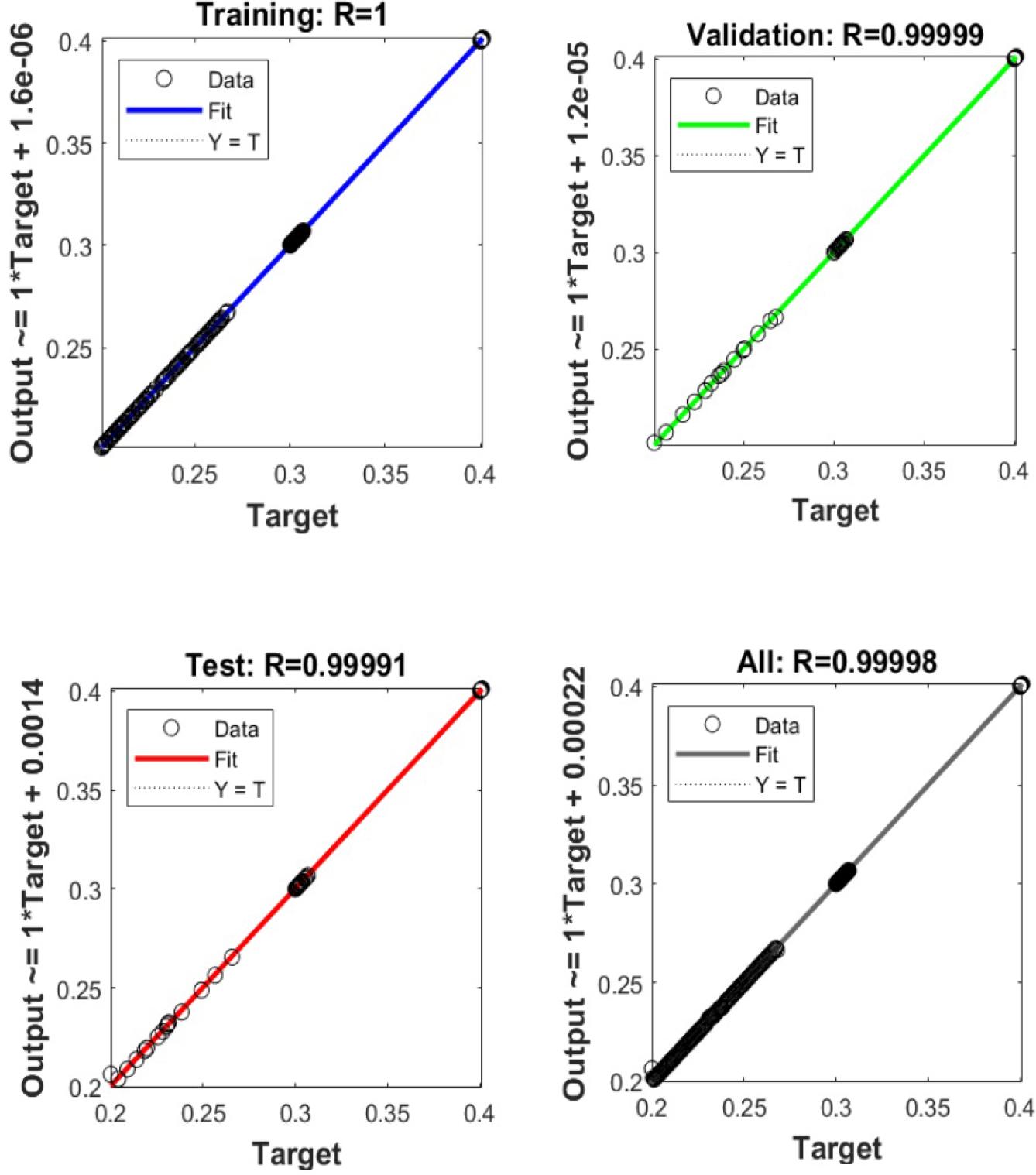 Figures (4,5,6,7,8) indicate the numerical FLCOS results using the training performances of LMBP. Figure (4) (a to c) designates the best authentication, while the transition state (Tran. State) are provided in Figure (4) (d to f). The best authentication are provided to reduce the mean square error (MSE) for FLCOS results using the training performances of LMBP at epochs 31, 14 and 7 for 1st to 3rd case of the model, which are reported as 2.81833x10−11, 8.91222x10−09, and 8.50954x10−09. The LMBP method offers optimal verification capabilities using optimal integration, which is often determined by indicators like MSE. The LMBP values are reported via fast convergence to perform the insignificant error, which widely applied in small iterations. By minimizing the discrepancy between observed and anticipated results, LMBP effectively optimizes the algorithm’s biases and weights, improving its reliability and precision. The performance-oriented ideal verification is primarily accomplished by meticulously altering the hyper parameter settings and carrying out the proper system configuration. The Tran. State values are given in Figure (4) (to f), which are performed as 4.8078x10−09, 7.2278 x10−08, and 2.9779x10−08, whereas the values of Mu are shown as 1x10−12, 1x10−11, and 1x10−10 for the mathematical FLCOS. The gradient’s measurements indicate the pace of inaccuracy shift depending on the set of parameters that guide the procedure for optimization. Mu introduces a value of normalization, also known as the coefficient of dampening, that is utilized to improve both the direction and through modifying the Gauss-Newton techniques and steepest decline. The gradient’s efficiency often decreases as the initial numbers rise, indicating closure. Nonetheless, Mu controls to allow for steady and efficient efficiency, which has been primarily improved as it is not the ideal result. Figure (5) (a to c) describes the fitting curve for the FLCOS results using the training performances of LMBP. The fitness function (Fit. Funct) measures for output elements is normally achieved via various metrics. By optimizing the networks parameters and weights, the technique lowers mistakes and improves the predicted results’ fit to actual information. The Fit. Funct strong results demonstrate the framework’s basic architecture for effectively obtaining information. The values based on the error histogram (Err. Hist) are illustrated in Figure (4) (d to f), which are 2.46x10−08, 9.92x10−07 and 1.49x10−05 for the FLCOS results using the training performances of LMBP. The error dispersion in real and anticipated results throughout the testing, authentication, and training phases of datais displayed by Err. Hist in LMBP using 20 bins, highlighting the efficiency of the framework. Figs. 6 to 8 present the regression illustrations the FLCOS results using the training performances of LMBP. These regression depictions indicate fast process via input ranks connecting for the objective topics. Table 2 indicates the FLCOS results using the training performances of LMBP.