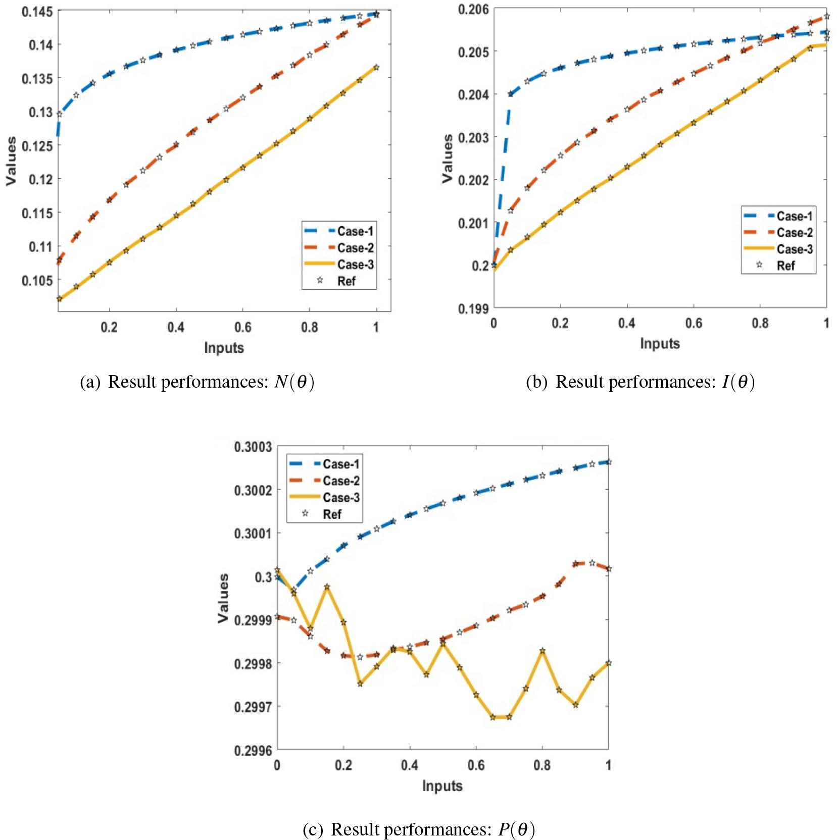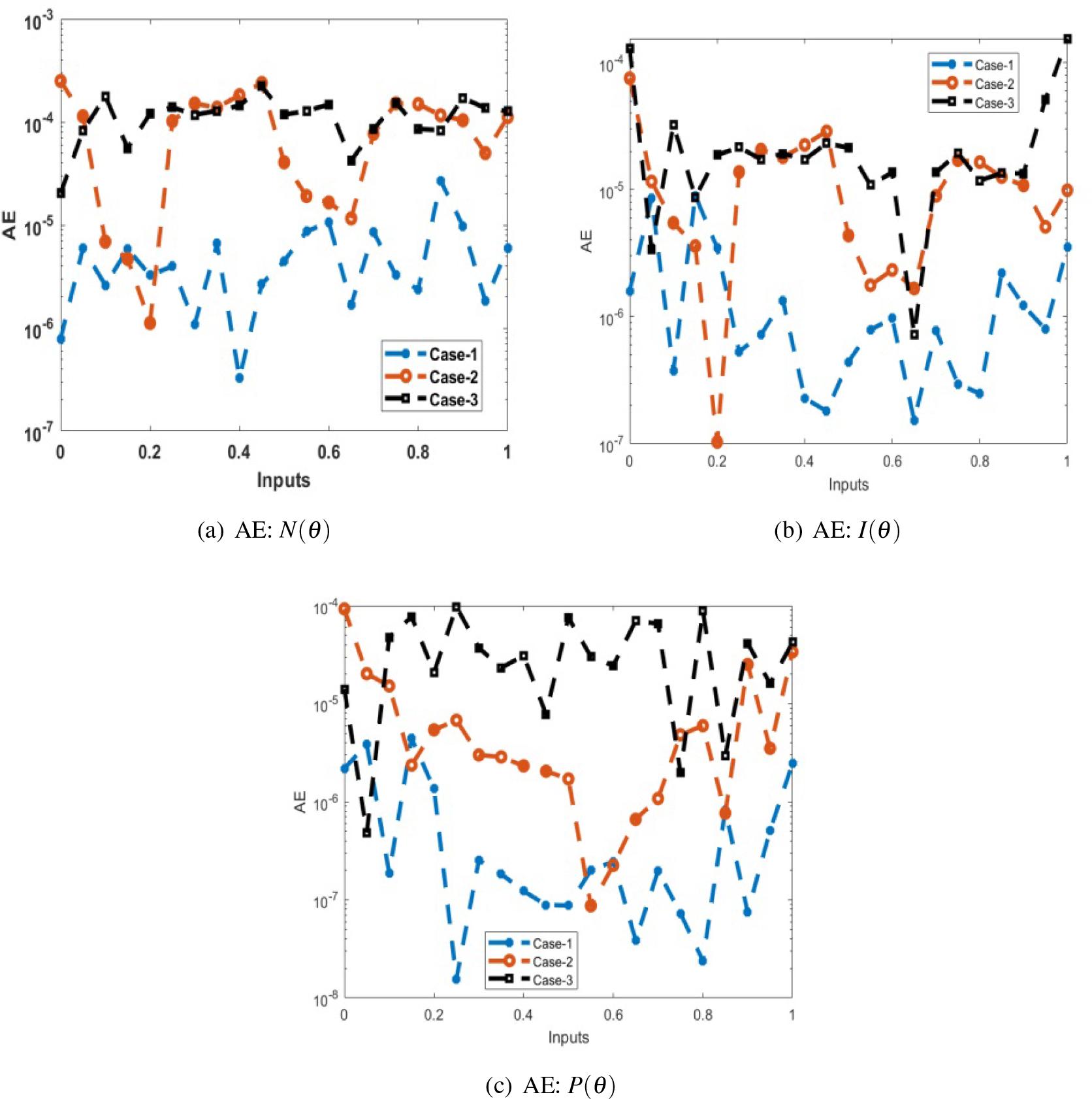 Figure 9 presents the numerical results of the FLCOS using the design of LMBP neural network, which shows that the overlapping of the results is performed for each FLCOS case. These matching indicates the correctness of the proposed solver. Figure 10 presents the AE values for each case of the model, which shows that most of the values are performed around 10−04 to 10−06 for each case of the FLCOS. These insignificant AE enhances the worth of the proposed scheme.