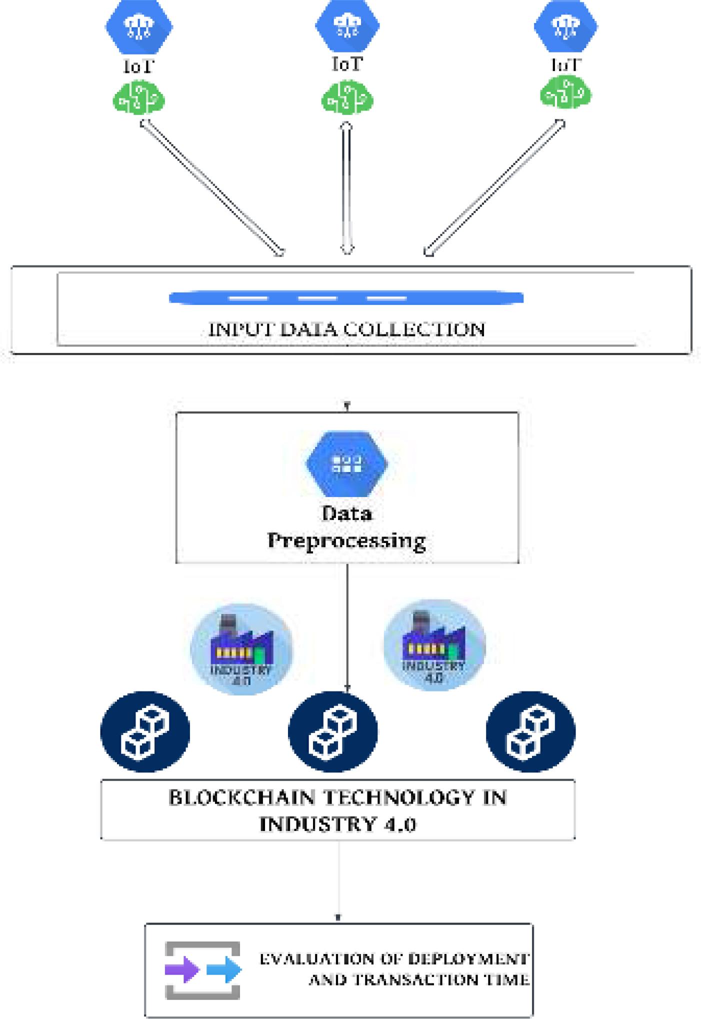 The process begins with data cleaning, where missing values, null values and anomalies are identified and removed to improve data quality. This is followed by data transformation, in which categorical attributes, such as device types or operational states, are converted into numerical formats using the Label Encoding technique provided by Scikit-Learn, enabling seamless integration into blockchain transactions and analytical models. Finally, data normalization is performed using the Min-Max scaling technique, which resizes numerical features to a uniform range of 0 to 1. This step ensures consistency across data attributes and prevents biases during blockchain validation and analytical computations. By standardizing the data, this pre-processing pipeline enables efficient handling of large-scale industrial datasets while maintaining security and reliability.