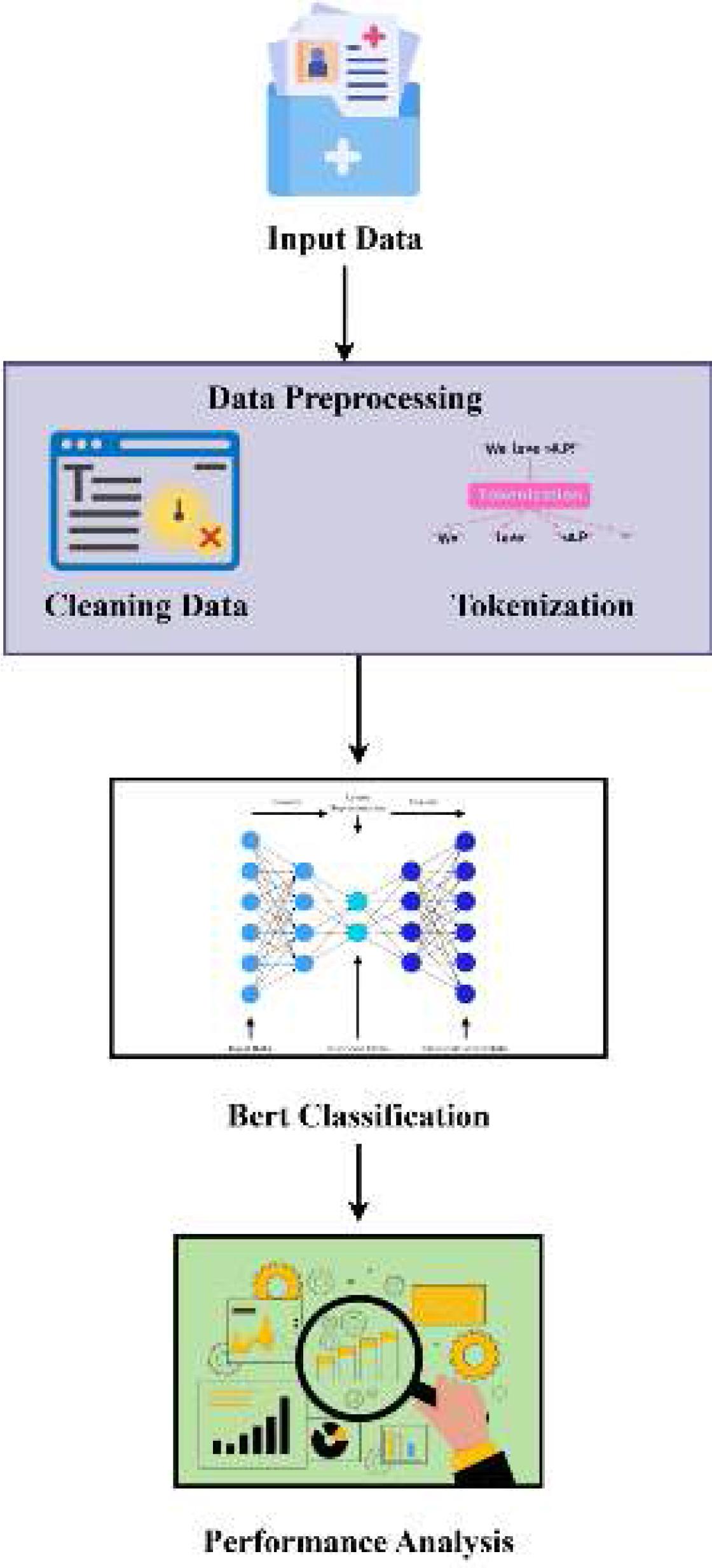 The processed text is tokenized, partition text into smaller units (tokens) like words or subwords. Tokenization also involves converting words into corresponding tokens using BERT's pre-trained tokenizer, which further converts these tokens into numerical IDs.