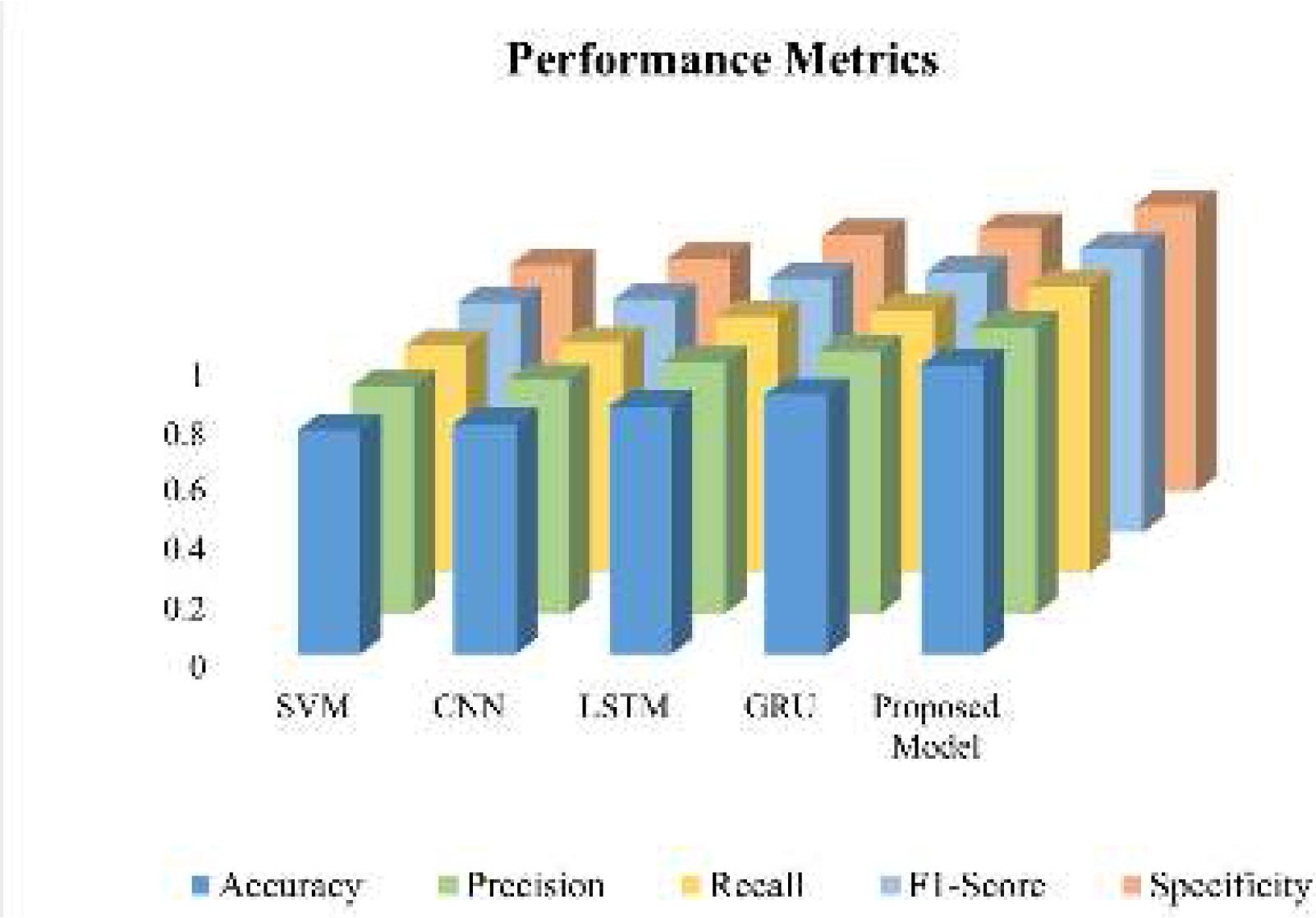 Figure 2 provides a visual comparison of the performance metrics—accuracy, precision, recall, F1-score, and specificity across SVM, CNN, LSTM, GRU, and the recommended approach. It clearly shows that while traditional models like SVM and CNN offer modest performance, with accuracy values around 0.77 and 0.79, the LSTM and GRU models significantly outperform them, with accuracies reaching 0.85 and 0.89, respectively. The proposed model stands out as the most effective, achieving near-perfect accuracy of 0.99 and excelling in all other metrics. This reinforces the model's ability to accurately detect and classify both positive and negative instances, demonstrating its optimal outcome in comparison to the varied approaches tested.