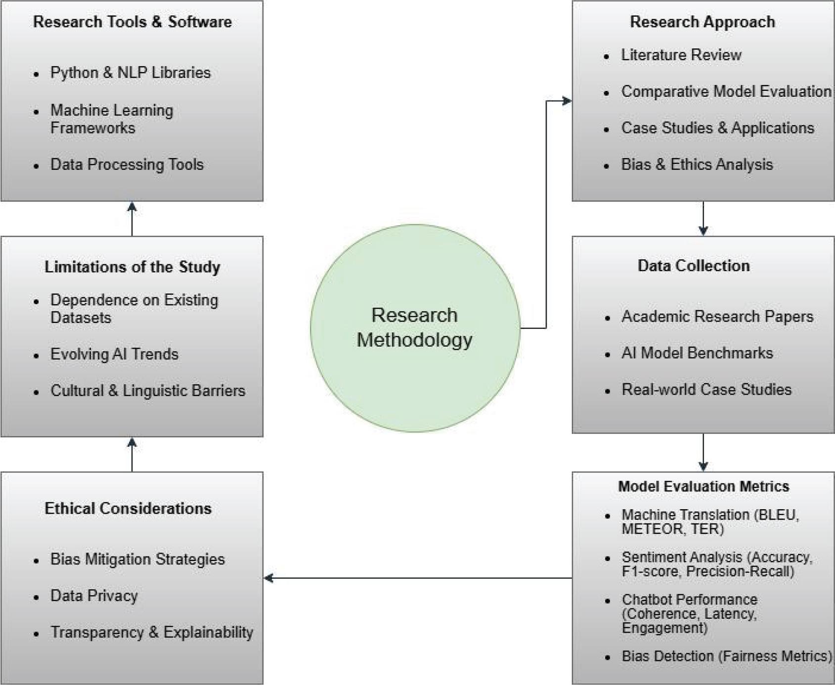 The methodology includes a literature review and AI-based model analysis, along with quantitative and qualitative analysis of linguistic datasets. It incorporates transformer-based Seq2Seq models evaluated using BLEU and ROUGE, alongside a review of bias mitigation techniques and an examination of ethical concerns and infrastructure gaps. A comparative analysis is conducted between ChatGPT and Claude using a hostility index, as well as between linguistic and argumentative models for persuasion. Traditional NLP techniques such as Bag of Words (BoW), TF-IDF, and Naïve Bayes are assessed, while retrieval systems are compared before and after NLP integration. The study evaluates chatbot communication efficiency and challenges, pyrolysis process analysis, and adoption factors among students. It also investigates LLMs replicating human evaluators, comparing human vs AI attention patterns and proposing a transparency and consent framework. Further, AI-driven religious applications, GPT-3.5 and LLaMA-2 performance, and the development of the Lucy chatbot using BERT and RoBERTa are analyzed. Sentiment analysis, translation, and speech recognition techniques are explored, integrating Hofstede’s dimensions and deep learning-based NLP analysis. Social media sentiment analysis and topic modeling are examined, along with the ChatGPT Role-play Dataset (CRD). The integration of cloud computing with data mining, taxonomy and framework design, AI-driven HR strategies, and Multidimensional Quality Metrics (MQM)-based analysis are included. Finally, a comparative analysis of ChatGPT and other models is conducted, emphasizing diverse methodological approaches with varying frequencies of application. As show in Figure 3.