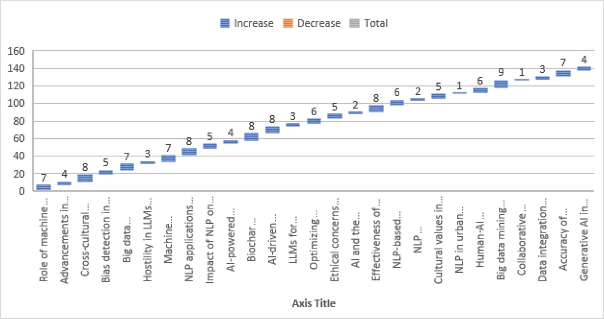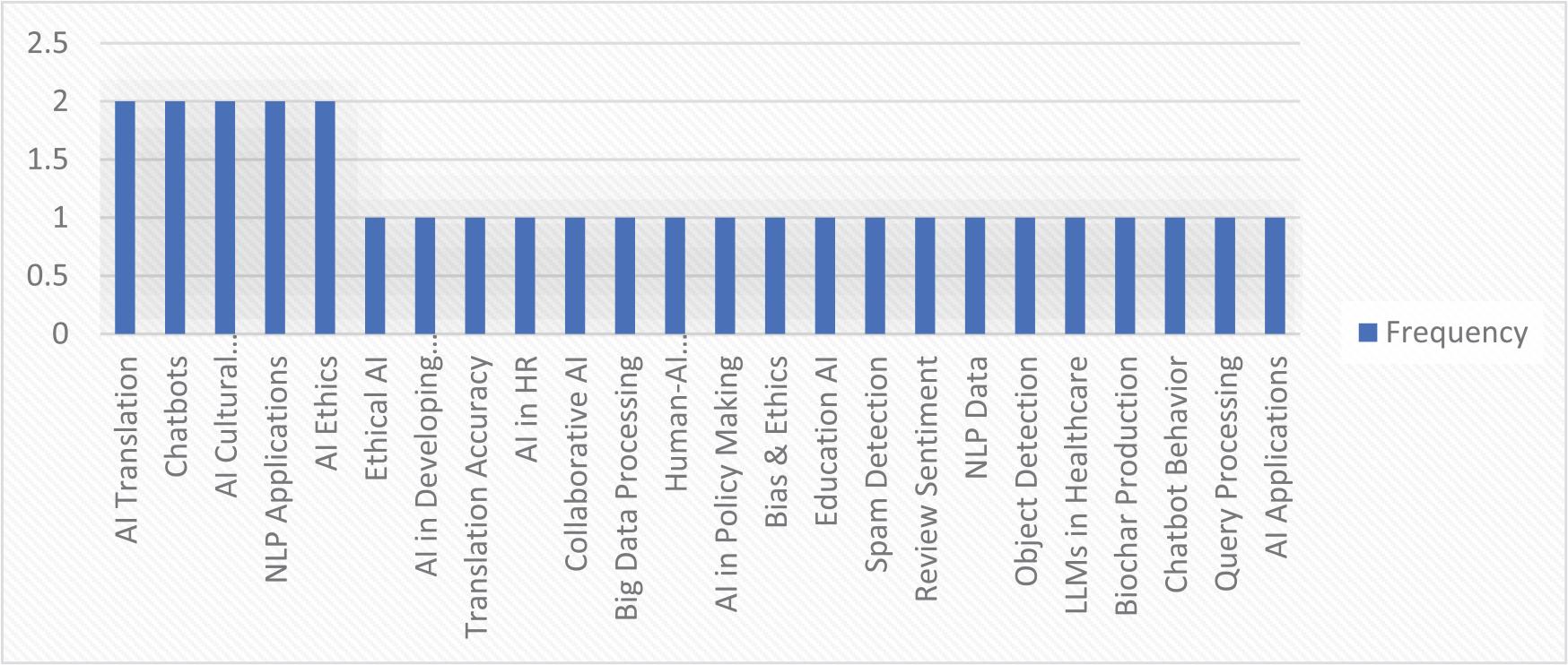 The table presents a diverse range of topics related to NLP, AI, and big data, each assigned a varying frequency to reflect their significance or occurrence in discussions. Topics such as Role of machine translation in overcoming linguistic barriers, Big data analytics & AI in developing countries, and Cross-cultural NLP focusing on Sundanese-Indonesian translation appear frequently, highlighting their relevance in addressing linguistic diversity and technological challenges. Similarly, Bias detection in NLP translation models, Impact of NLP on information retrieval, and Machine learning & NLP in persuasion detection showcase the growing concern over AI fairness, data processing efficiency, and influence detection. Other areas like AI-driven chatbots in academic advising, LLMs for automating medical Q&A evaluation, and Optimizing Visual Question Answering (VQA) for autonomous driving emphasize the increasing role of AI in specialized domains, from education to healthcare and autonomous systems. Ethical and societal implications are evident in discussions on Ethical concerns in AI research with human participants, AI and the psychology of religion, and Cultural values in AI dialogue systems, underscoring the need for responsible AI development. Furthermore, Big data mining in cloud systems, Collaborative Reinforcement Learning (CRL) systems, and Data integration in talent management highlight technological advancements aimed at optimizing computational processes. Finally, Generative AI in NLP and the Accuracy of Instagram’s NMT for literary texts reflect ongoing progress in AI-driven language models and their applications, reinforcing the intersection of AI, language, and societal impact as show in Figure 2.