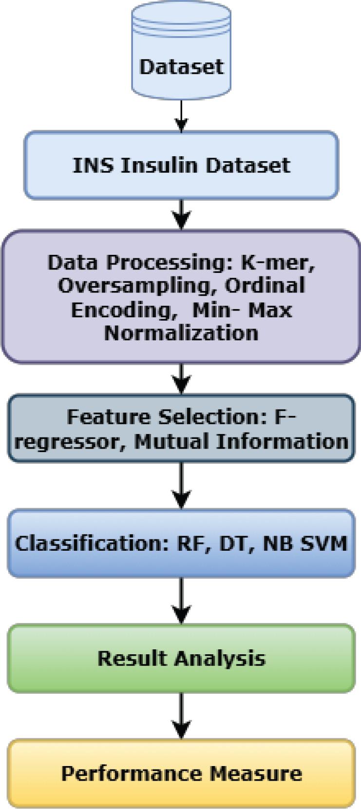 INS Insulin Dataset has been made available by the National Agency for Health, a renowned research institute in health and medicine. A genetic variation in insulin was found in the diabetes mellitus dataset. In addition to DNA sequences and clinical data, the INS Insulin Dataset includes additional diabetic patients with T1D and T2D. Ten,199 sequences are diabetes-related, while 4,371 are non-diabetic [26].