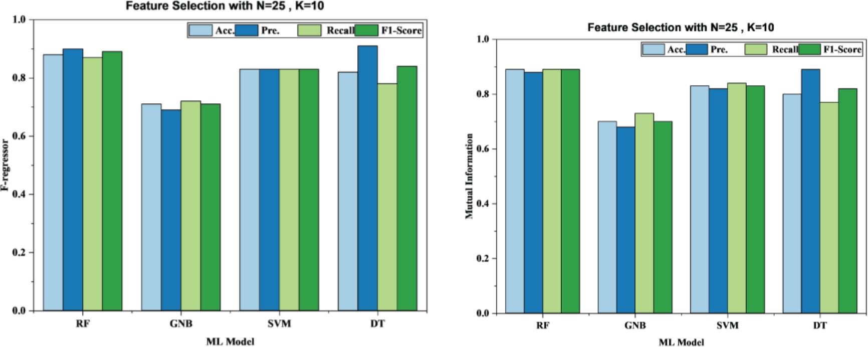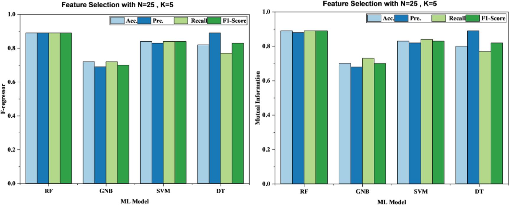 Random Forest demonstrated strong accuracy with 0.89 using the F-regressor and 0.88 with the mutual information method, even though the precision, recall, and F1-Score were competitive. Gaussian Naive Bayes performed less effectively than Random Forest, as seen in Figure 3, showing only decent performance during F-regressor trials and overall average results with acceptable precision across test cases. This method is suitable for many single hypothesis problems but less effective in scenarios with more dimensions. A significant improvement was made in the classification algorithms by using SVMs and Decision Trees. Mutual information and the F-regressor were used to evaluate each model. SVMs based on mutual information and F-regressor had accuracy of 0.83 and 0.84, respectively. It was found that SVMs, like Random Forests, improved reliability and F1-scores as features were selected. Using the mutual information approach, there was good precision and recall for Decision Trees, however, they were less accurate than Random Forests and SVM classifier algorithms. It is more reliable and easier to achieve academic success when multiple classifiers are combined in deep neural networks or ensembles.