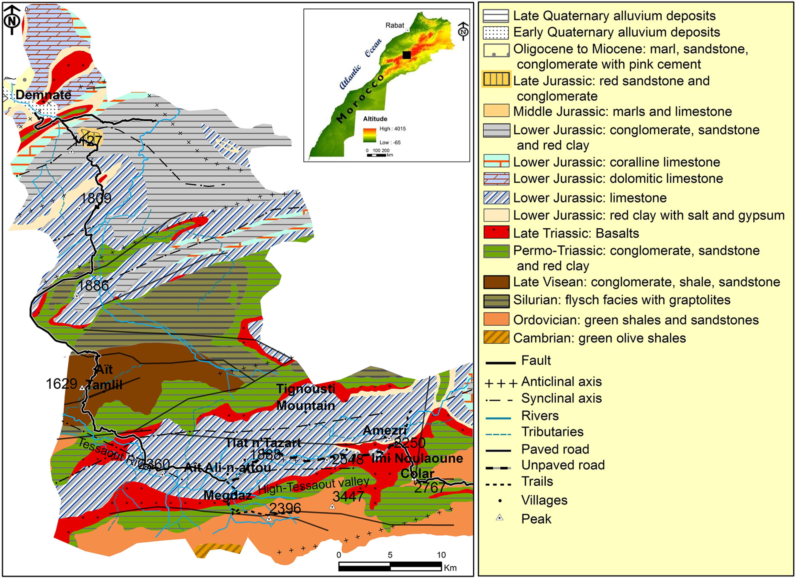 | 26 | Angular unconformity between the Palaeozoic (Cambrian-Ordovician metamorphic rocks) and the secondary (Triassic sedimentary rocks) of Almsa | Aït Tamlil | Shale, sandstone + Limestone | Point | No |