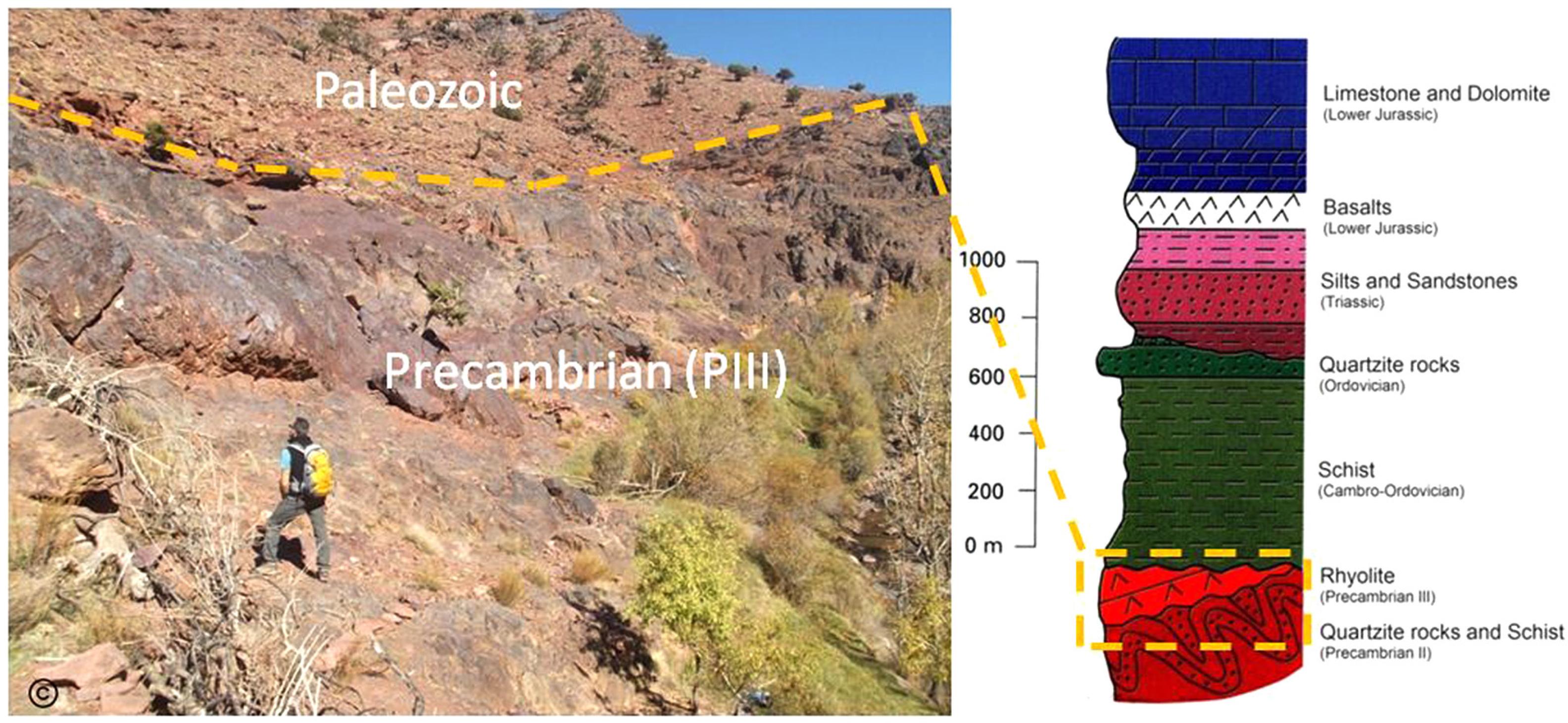 | 25 | Angular unconformity between the Precambrian (PIII) and the Paleozoic (Cambro-rdovician) | Megdaz | Rhyolite, quartzite+ Sandstone | Site | No |