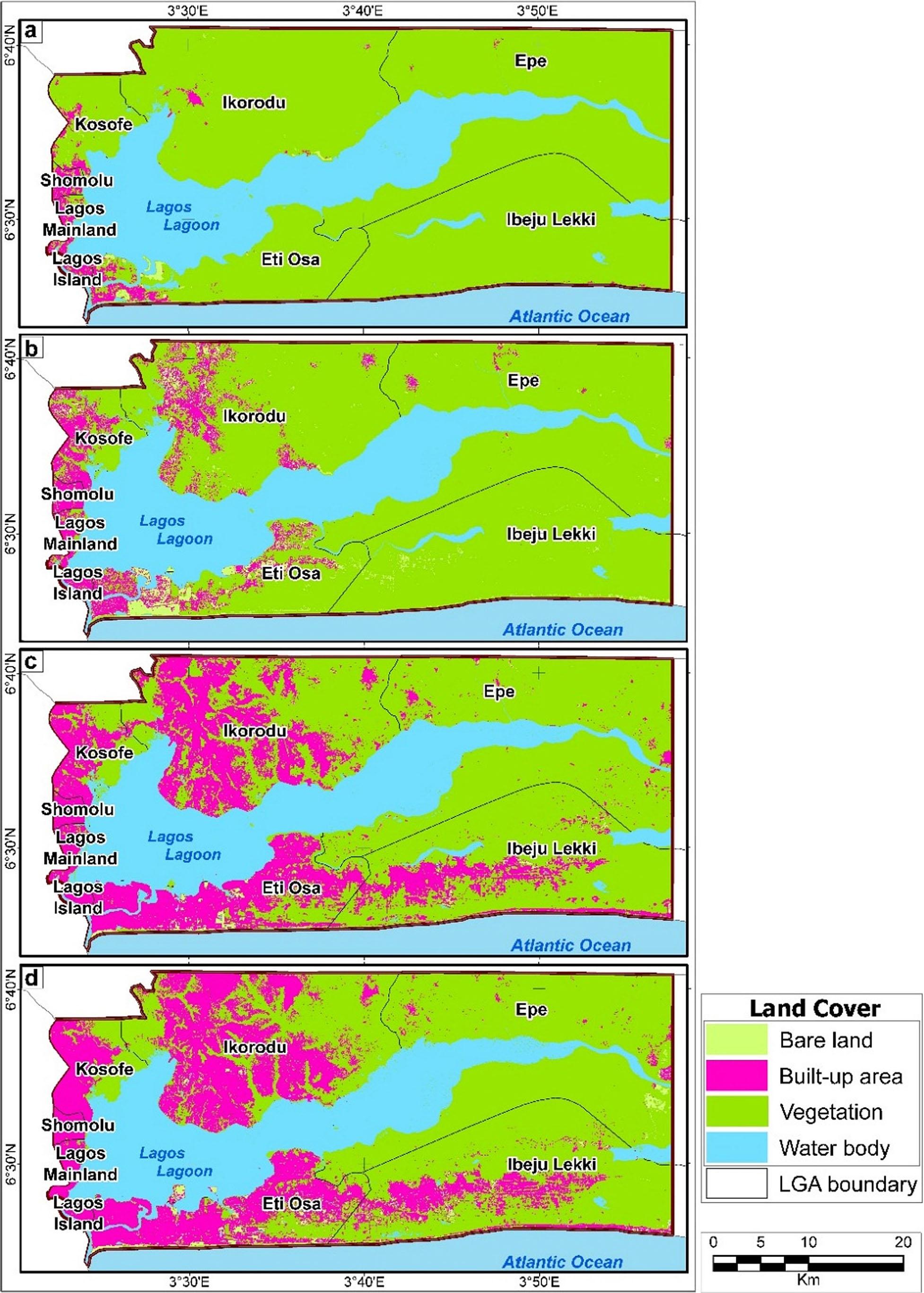 Medium resolution Landsat imageries for 4 years were acquired from the United States Geological Surveys Earth Explorer portal (USGS 2020). On the Earth Explorer webpage, the appropriate search criteria were set and the imageries were downloaded. Following the approach of Ferrelli et al. (2018), imageries with excessive cloud cover were discarded. To maximise the coverage of the available scenes, a combination of Landsat scenes (191/055 and 191/056) was done to form a complete coverage of the study area at four average periods: 1984 (Thematic Mapper (TM)), 2002 (Enhanced Thematic Mapper (ETM+)), 2013 and 2019 (Operational Land Imager (OLI)/Thermal Infrared Sensor (TIRS)). These imageries are already geometrically corrected by USGS and ortho-rectified to Level 1 (Tatem et al. 2006, Gutman et al. 2013). A further confirmation of the geometric/positional suitability of the Landsat scenes was done with reference to the Lagos State boundary along the Lagos shoreline through overlay and the alignment was satisfactory. The scenes used for land cover classification covered the following periods: TM (1984–1986), ETM+ (2001/2002) and OLI (December 2013 and January 2019); while scenes used for LST determination covered the following: TM (December 1984), ETM+ (February 2000) and TIRS (December 2013 and January 2018). For NDVI and EVI extraction, the imagery dates are as follows: TM (December 1984), ETM+ (December 2002) and OLI (December 2013 and January 2019). Generally, the imageries cover dry season months. The Landsat imageries have a pixel spacing of 30 m and are referenced to a Universal Transverse Mercator (UTM) coordinate system defined on the WGS84 datum (WGS84 UTM Zone 31N).