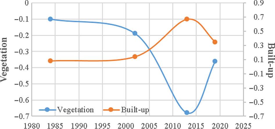 Table 11 presents the CI calculated for bare land, built-up area and vegetation. The analysis suggests that the increasing LSTs are largely attributable to the built-up areas due to the highest CIs of 0.08 in 1984, 0.14 in 2002, 0.67 in 2013 and 0.35 in 2019. Conversely, vegetation had a cooling influence and negative contribution to LST as evident in the CIs of −0.10 in 1984, −0.19 in 2002, −0.68 in 2013 and −0.36 in 2019. The cooling influence of the vegetation is increasing over time while the warming influence of built-up areas is also increasing.